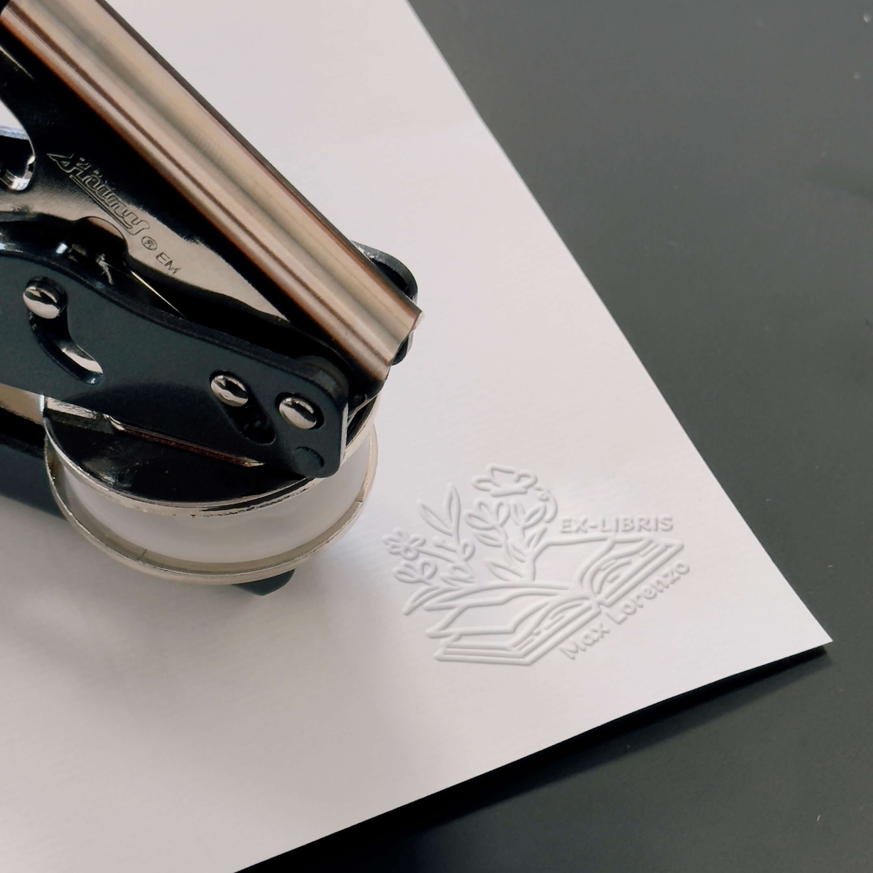 Personnalisez vos livres avec ce magnifique ex-libris végétal aux motifs de fleurs et papillon jaillissant d'un livre ouvert.