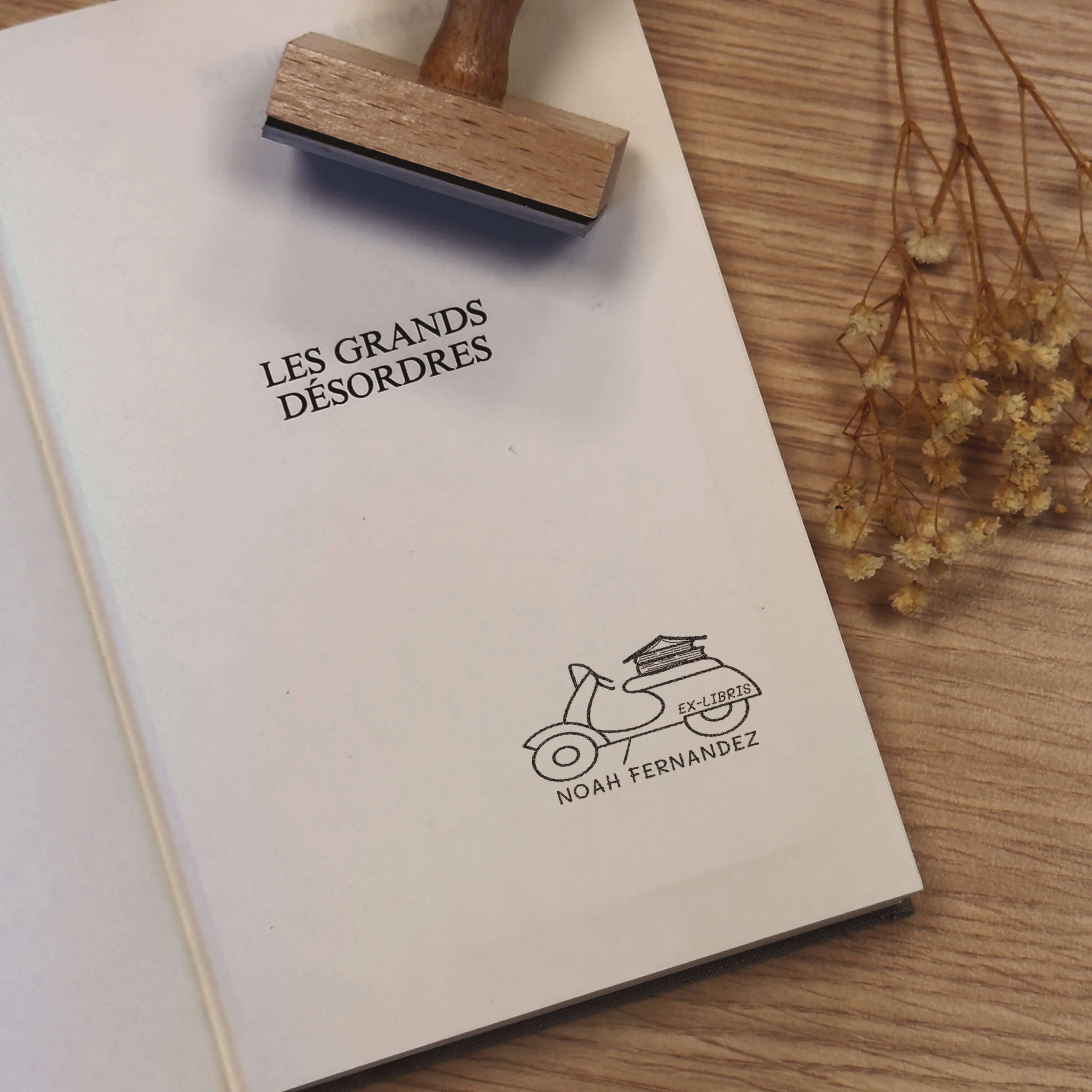 Créez votre signature personnalisée avec ce tampon scooter vintage transportant des livres, parfait pour marquer vos ouvrages d'un ex-libris unique et original.