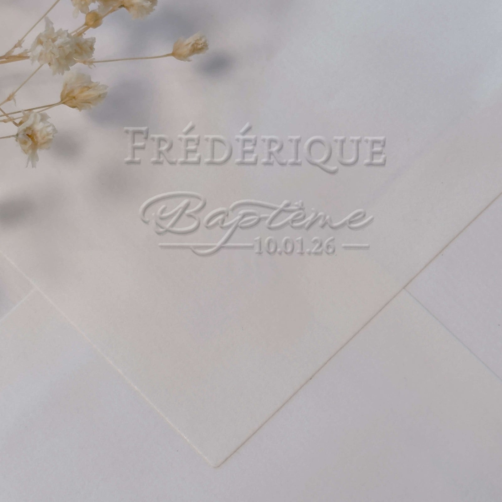 Personnalisez vos faire-part de baptême avec cette pince à gaufrer au design typographique raffiné, alliant calligraphie script et police serif dans un format rectangulaire horizontal.