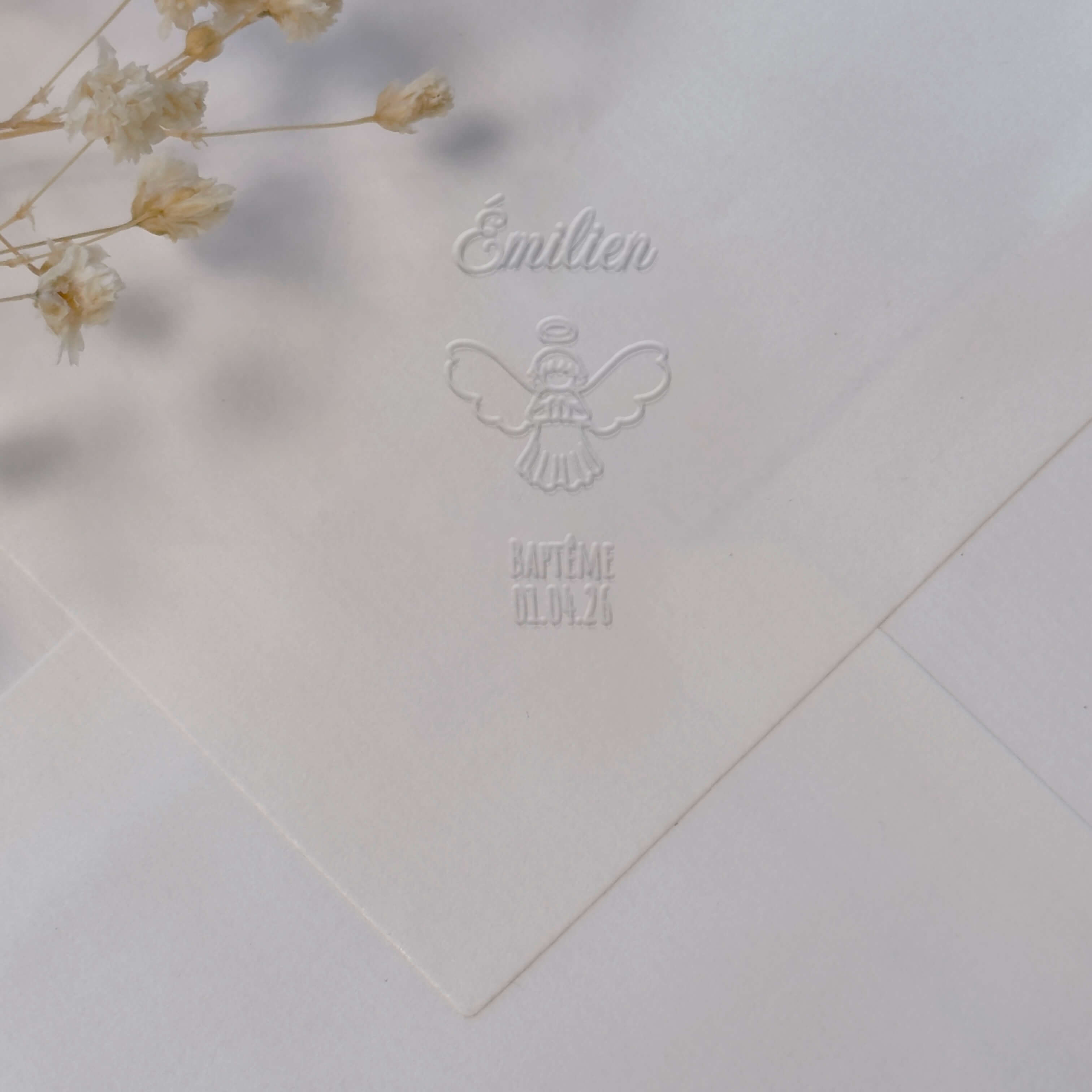 Créez une empreinte sèche unique pour célébrer le baptême avec ce modèle personnalisable représentant un ange enfant en prière.