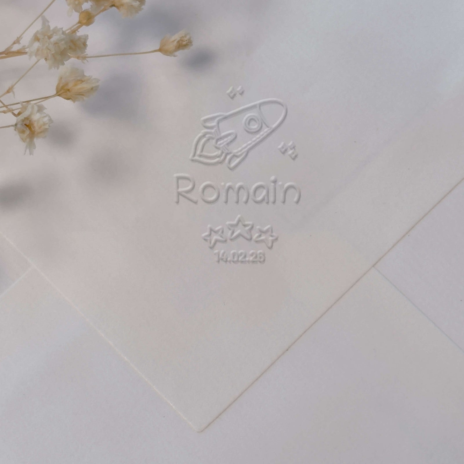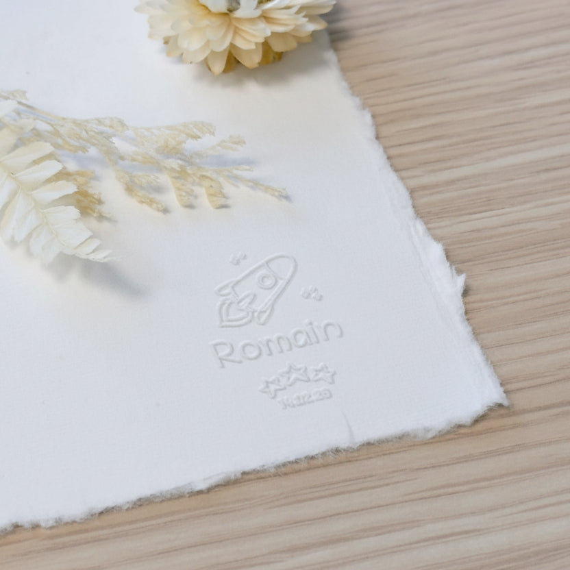 Créez un souvenir d'exception avec cet embosseur naissance fusée et étoiles, personnalisable avec le prénom et la date de naissance de votre enfant.
