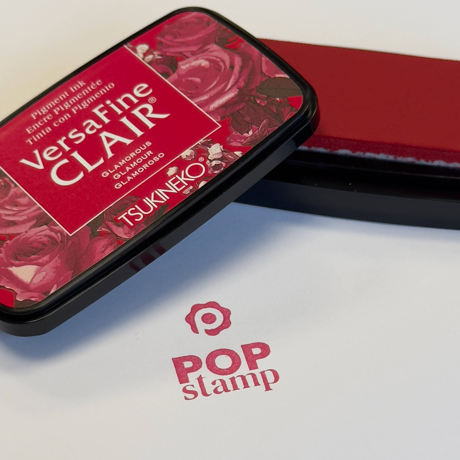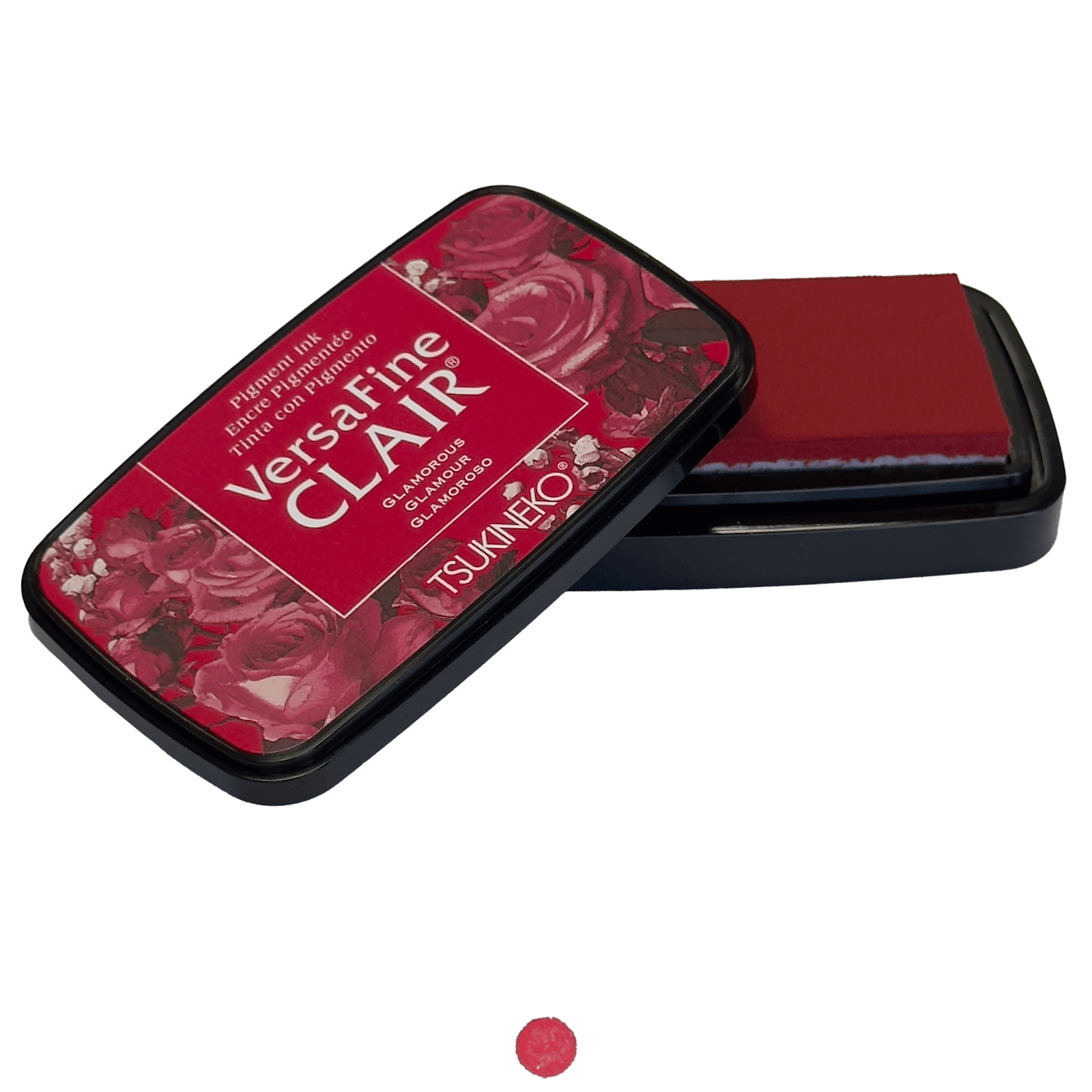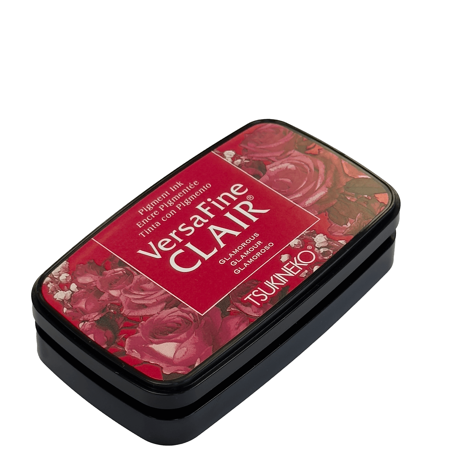 L'encre VersaFine CLAIR Glamour apporte une teinte rouge éclatante à vos créations avec un coussin encreur rectangulaire au design élégant orné de roses.