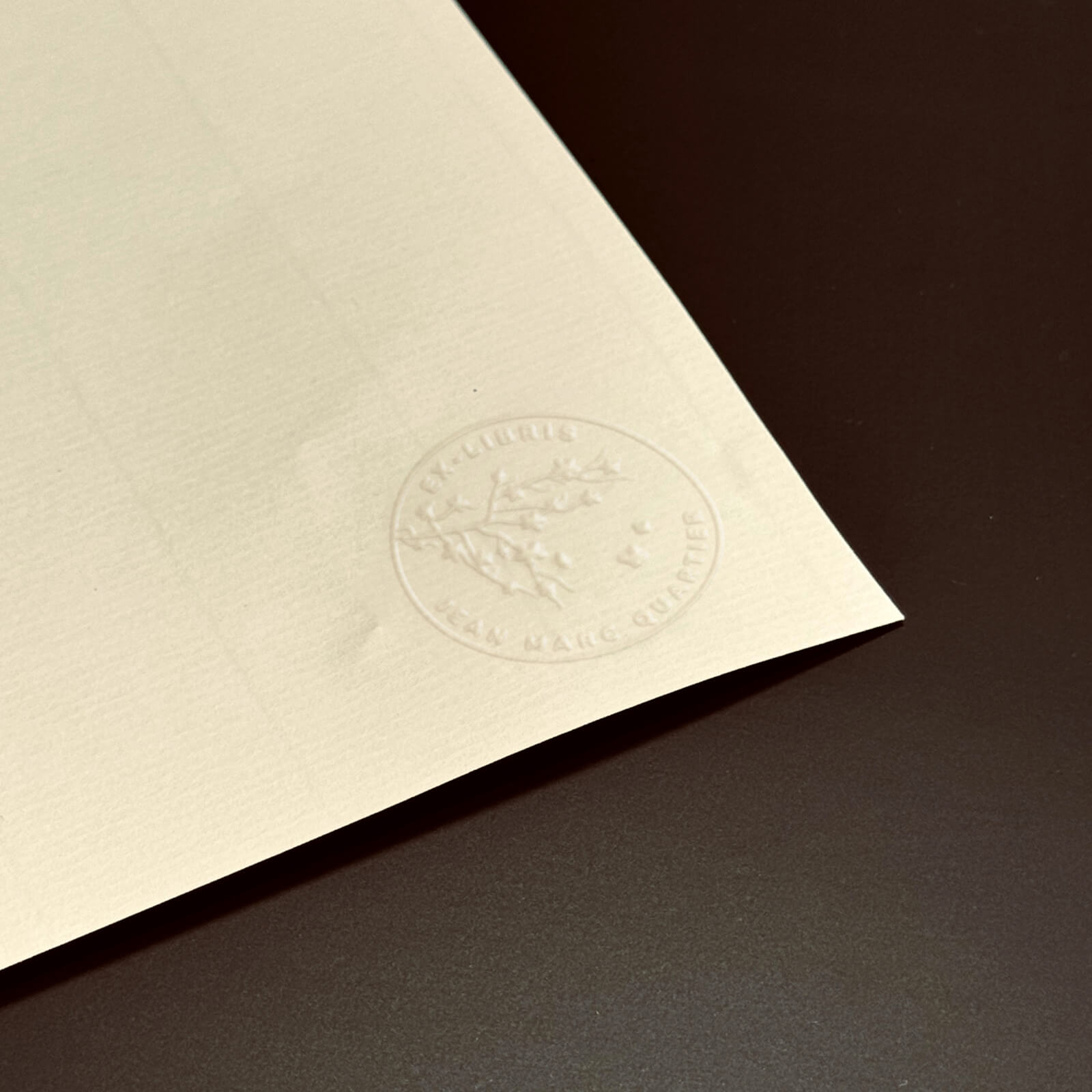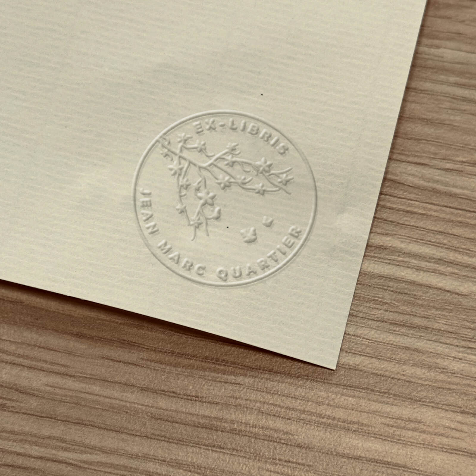 Imaginez donner une touche unique à vos livres, cartes ou correspondance grâce à notre timbre à sec 'Ex-libris branche fleurie'. Ce modèle sublime chaque page avec un design délicat qui peut être personnalisé selon votre convenance. Le motif principal représente une branche ornée de fleurs délicates, entourant un espace destiné à intégrer votre texte personnalisé.