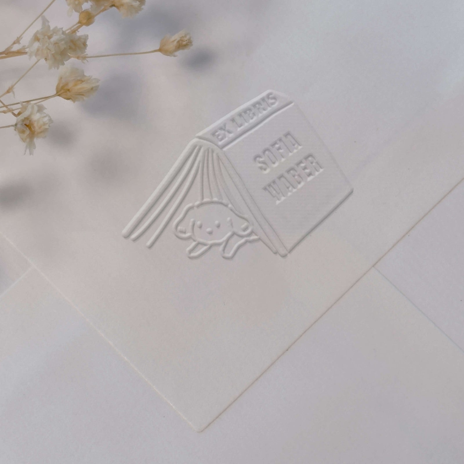 Personnalisez vos livres avec élégance grâce à ce modèle d'ex-libris au design charmant mettant en scène un petit chiot sous un livre entrouvert.