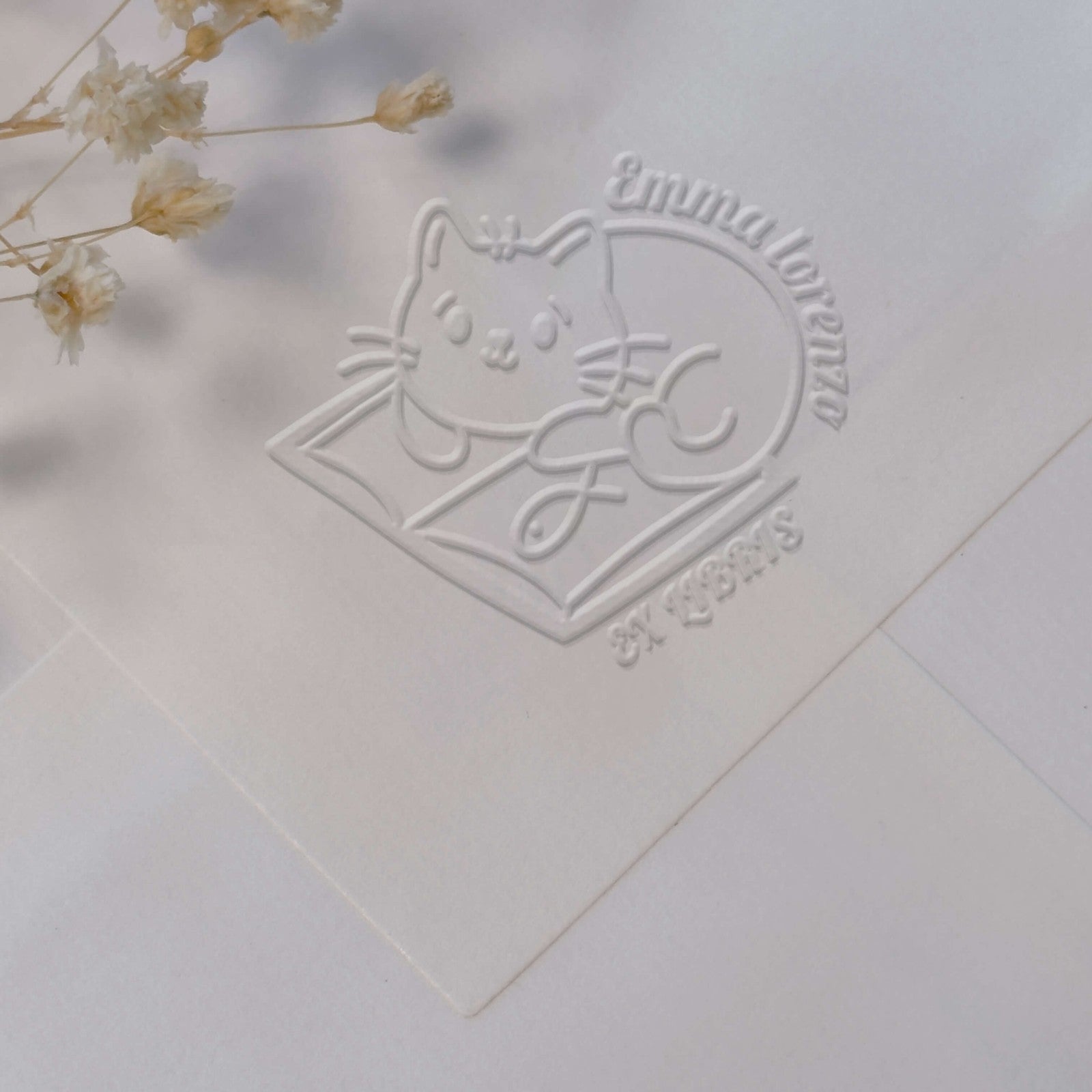 Transformez vos livres en propriété exclusive avec ce modèle de pince à gaufrer représentant un adorable chat allongé sur un livre ouvert, accompagné du texte « EX LIBRIS » et de votre nom personnalisable.