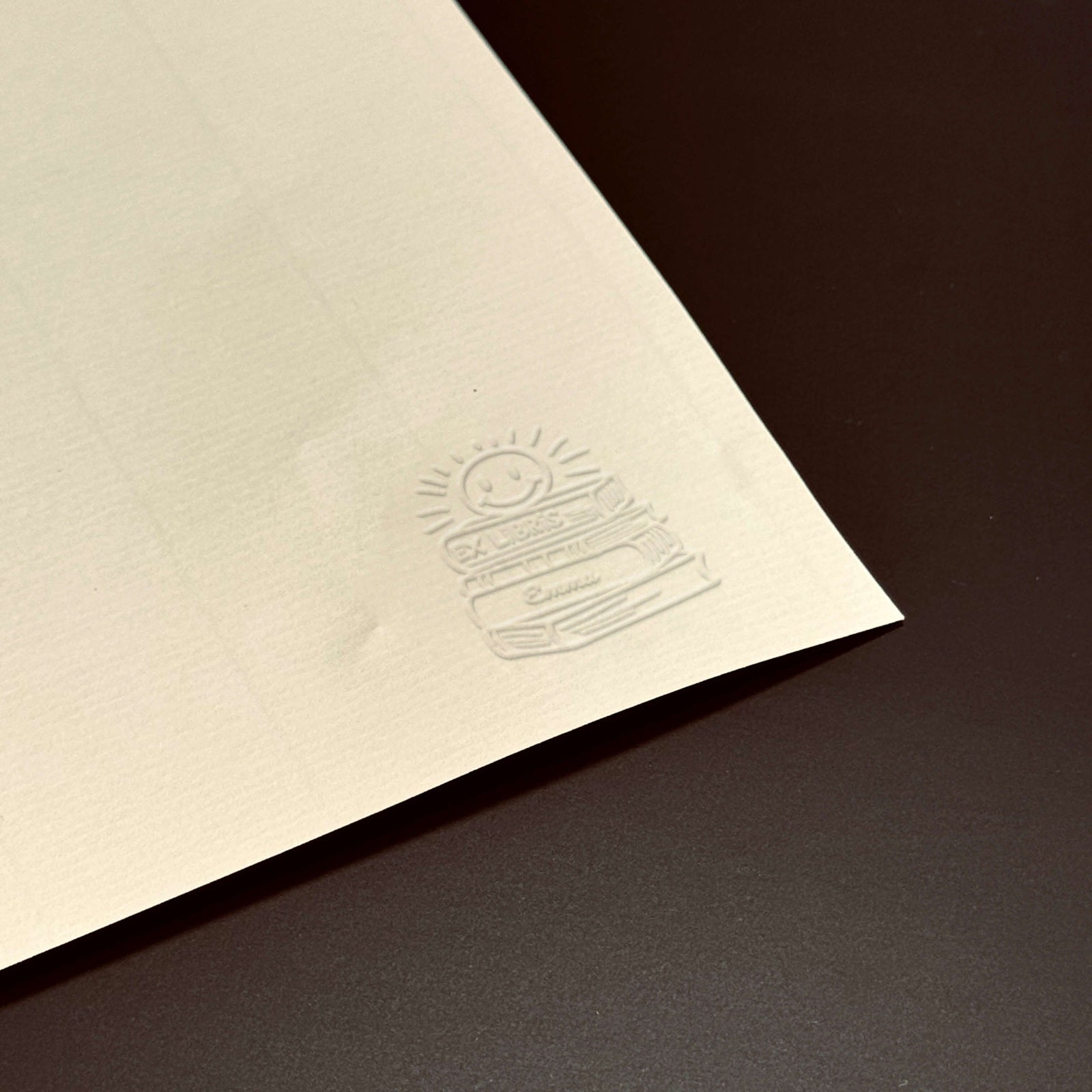 Personnalisez vos livres avec ce modèle ex-libris unique qui associe une pile de volumes à un soleil rayonnant souriant.
