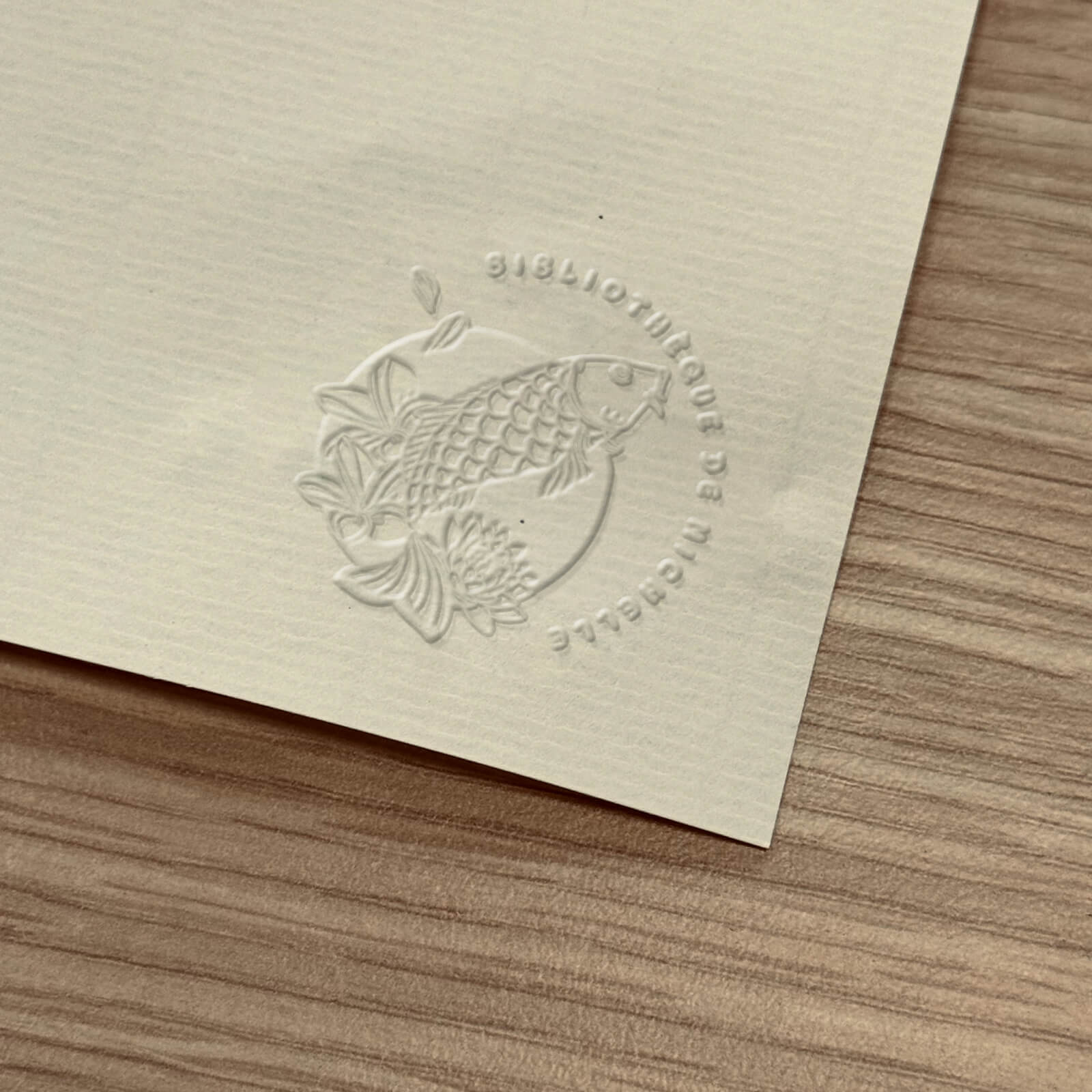 Imaginez marquer vos livres, œuvres d'art ou documents personnels avec une touche unique et artistique grâce à notre modèle de timbre à sec intitulé : Ex-libris poisson japonais. Ce modèle vous permet d'ajouter une signature raffinée et personnalisable à vos possessions les plus précieuses. Le timbre à sec représente un poisson japonais nageant délicatement à travers des vagues stylisées, entouré de texte personnalisable.