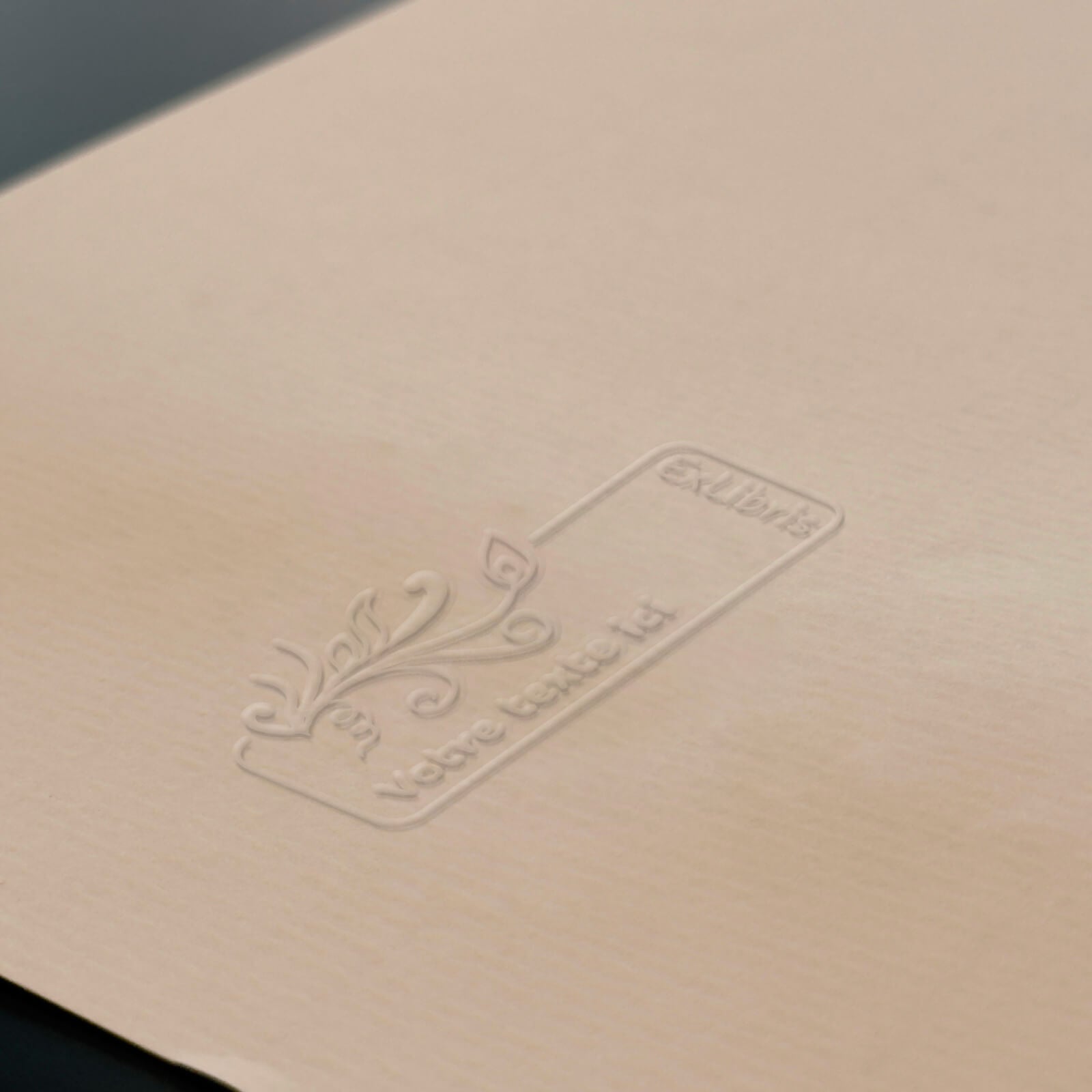 Imaginez personnaliser vos livres préférés avec une touche botanique grâce à notre modèle de timbre à sec intitulé : Ex-Libris Végétalisé. Ce timbre à sec unique vous permet de marquer vos livres avec un style distinctif et personnalisé. L'image montre un motif végétal entourant un espace où vous pouvez inscrire votre nom.