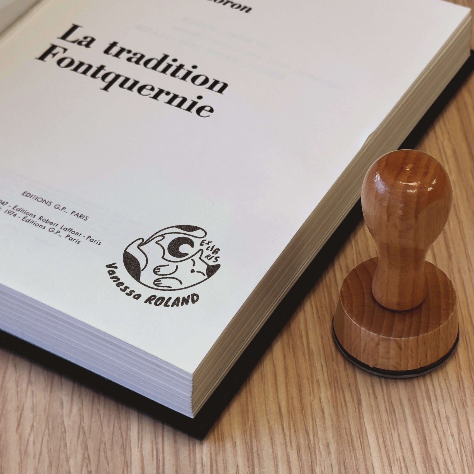 Créez votre propre ex-libris avec ce charmant motif de renard endormi autour d'un croissant de lune, personnalisable avec votre nom.