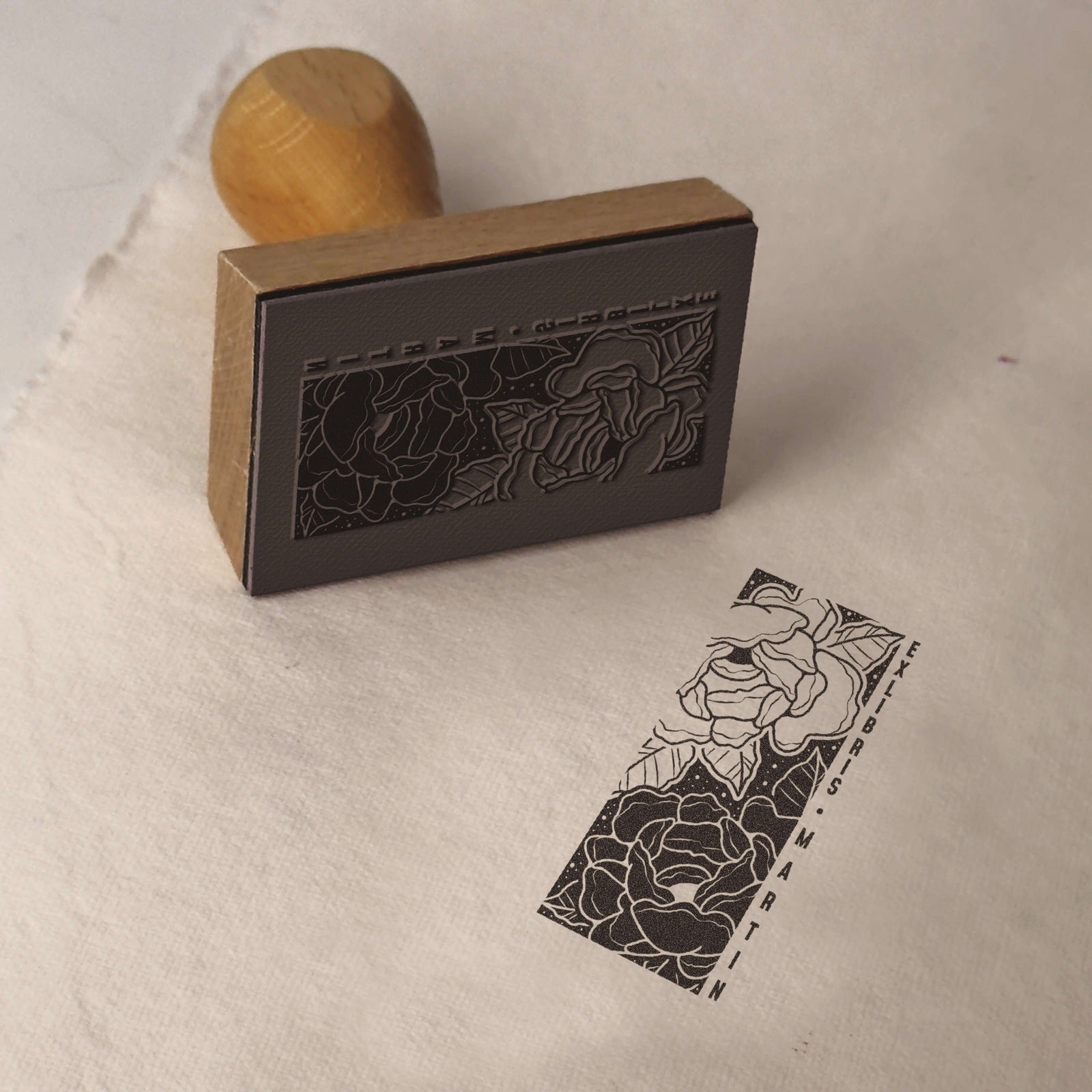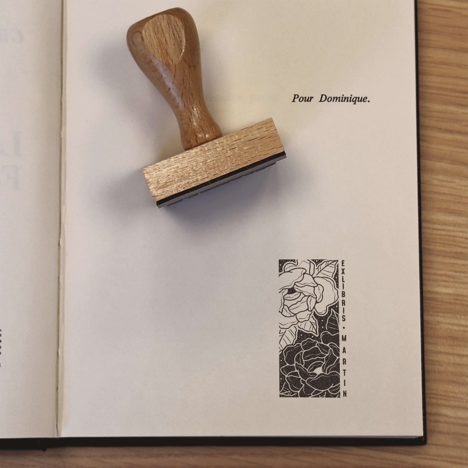 Personnalisez vos livres avec élégance grâce à ce tampon ex-libris aux motifs floraux raffinés, orné de roses stylisées dans un cadre rectangulaire vertical.