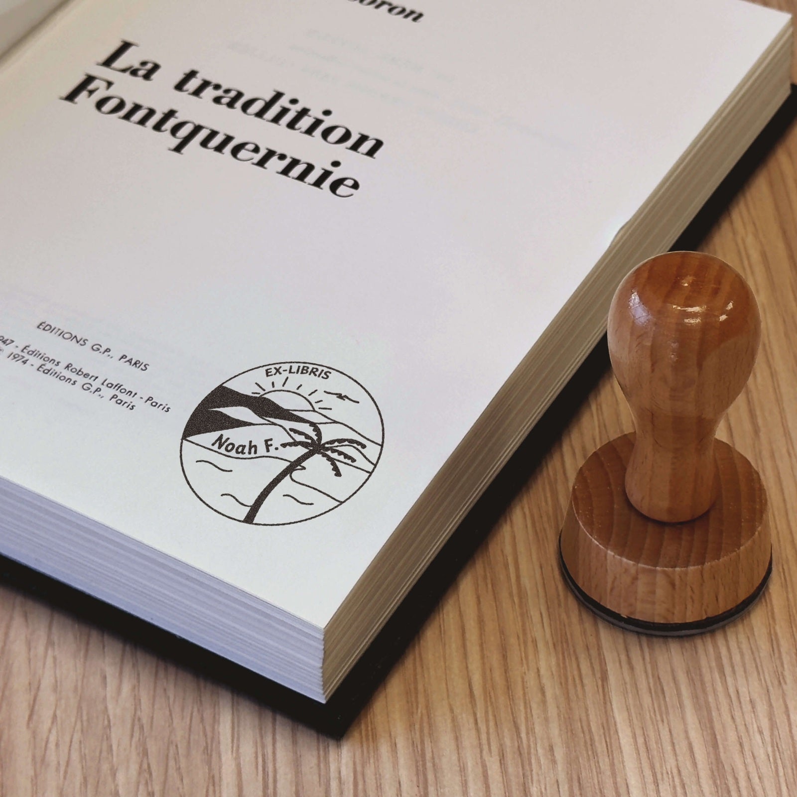Transformez vos livres en œuvres personnalisées avec ce modèle tampon bois ex-libris au motif tropical enchanteur.