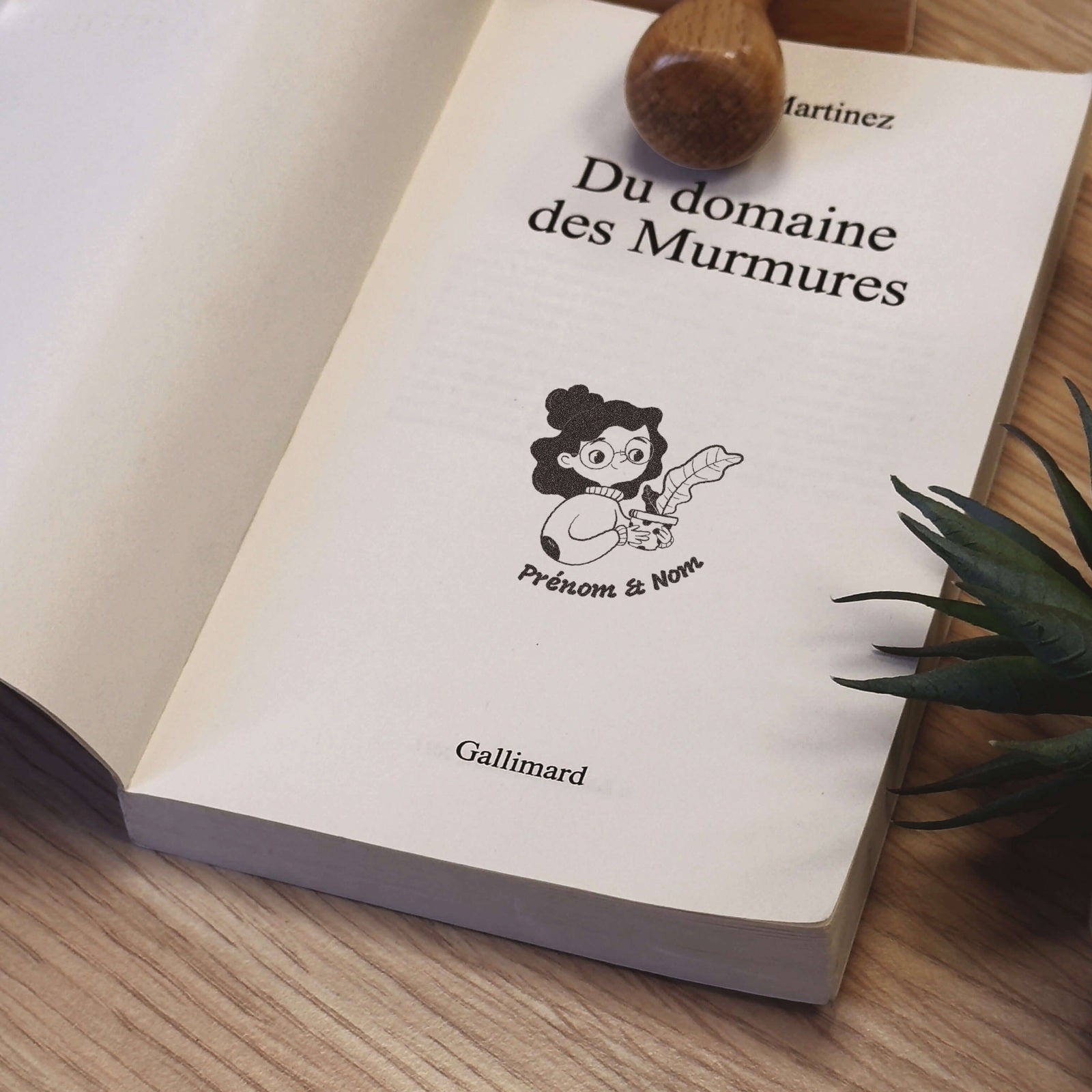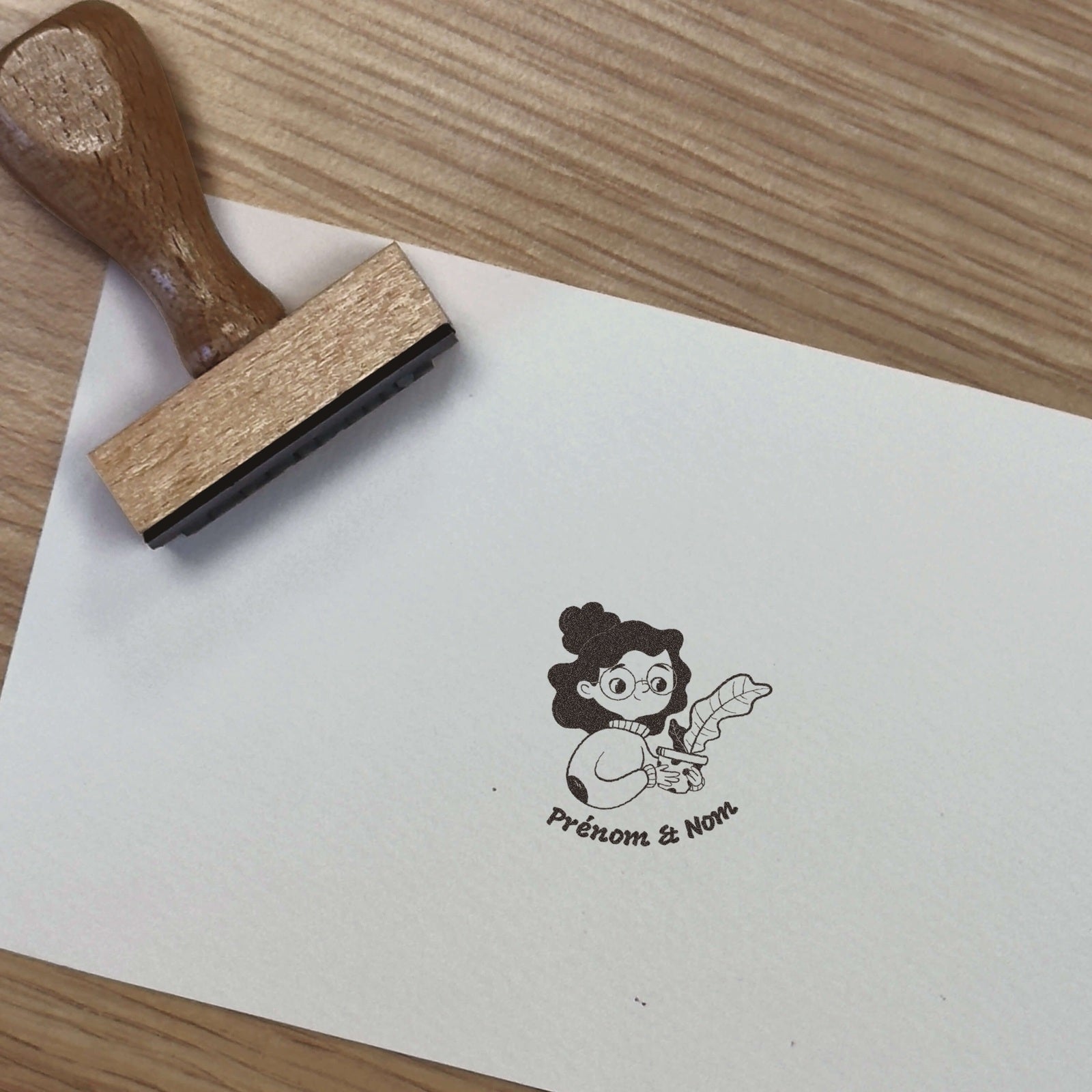 Créez votre ex-libris personnalisé avec ce charmant modèle de tampon représentant une jeune fille à lunettes tenant une plante en pot.