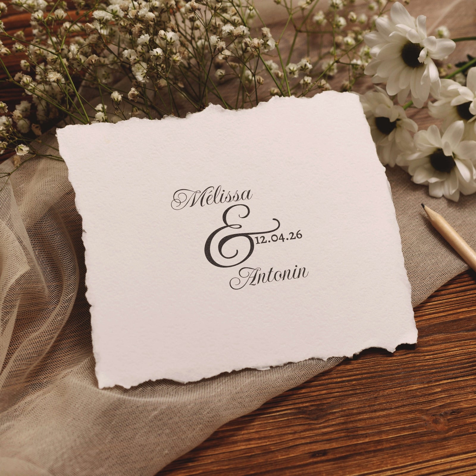 Personnalisez vos livres et documents avec ce modèle de tampon au motif typographique élégant, associant vos deux noms en calligraphie cursive avec une esperluette stylisée et votre date mémorable.
