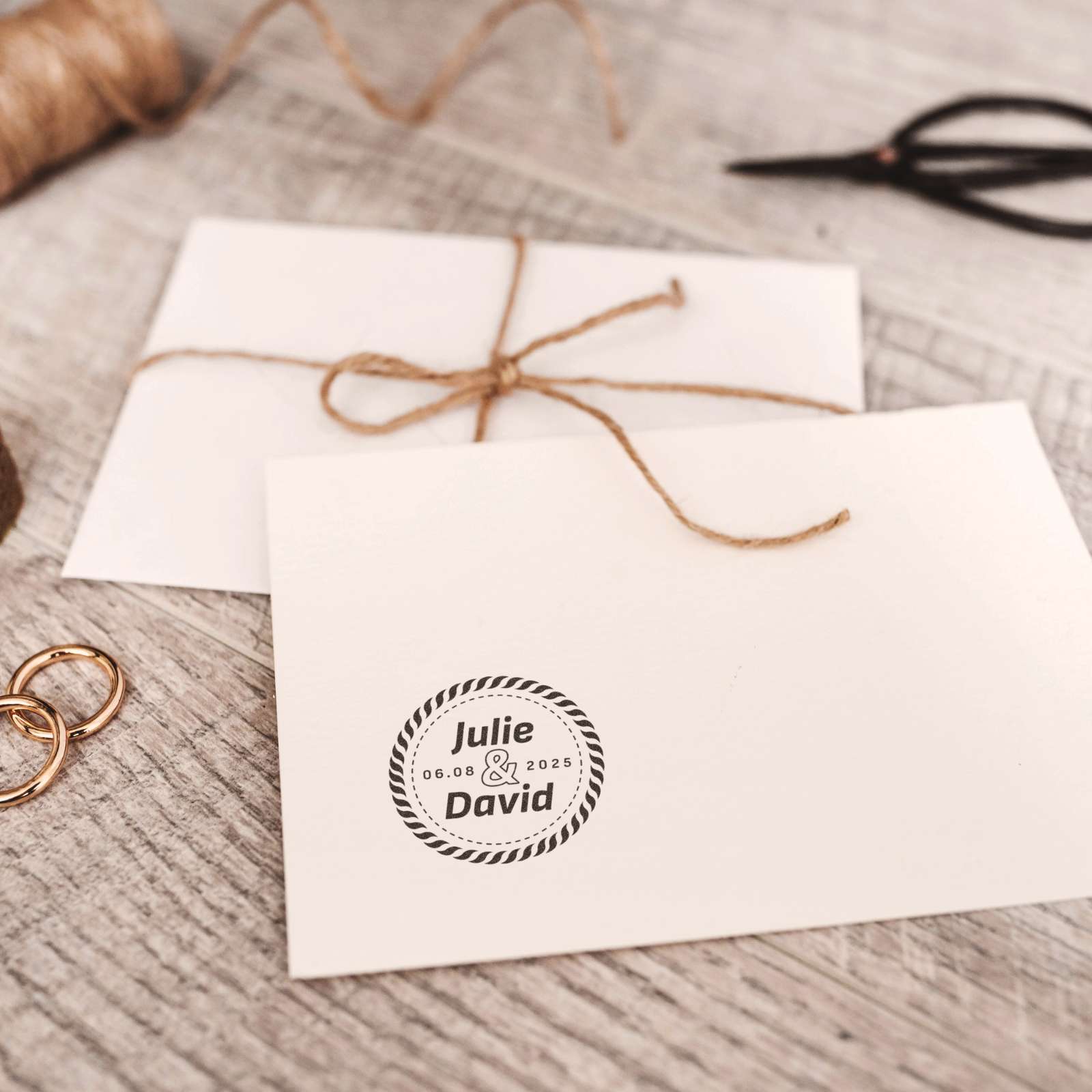 Sceau rond au style vintage avec bordure en corde torsadée, parfait pour personnaliser vos faire-part et souvenirs de mariage avec élégance.