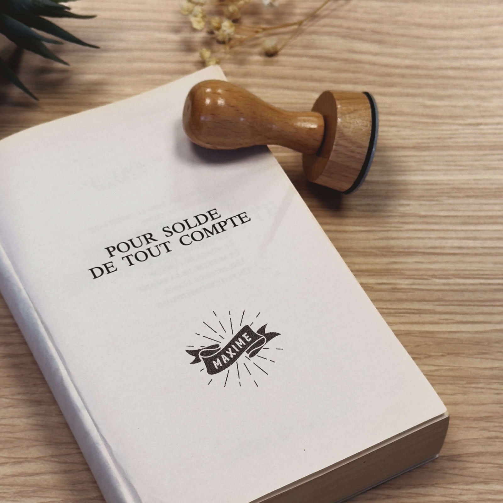 Personnalisez vos ex-libris avec ce magnifique tampon circulaire au style vintage, orné d'un ruban déroulé et de rayons éclatés pour un rendu élégant et authentique.